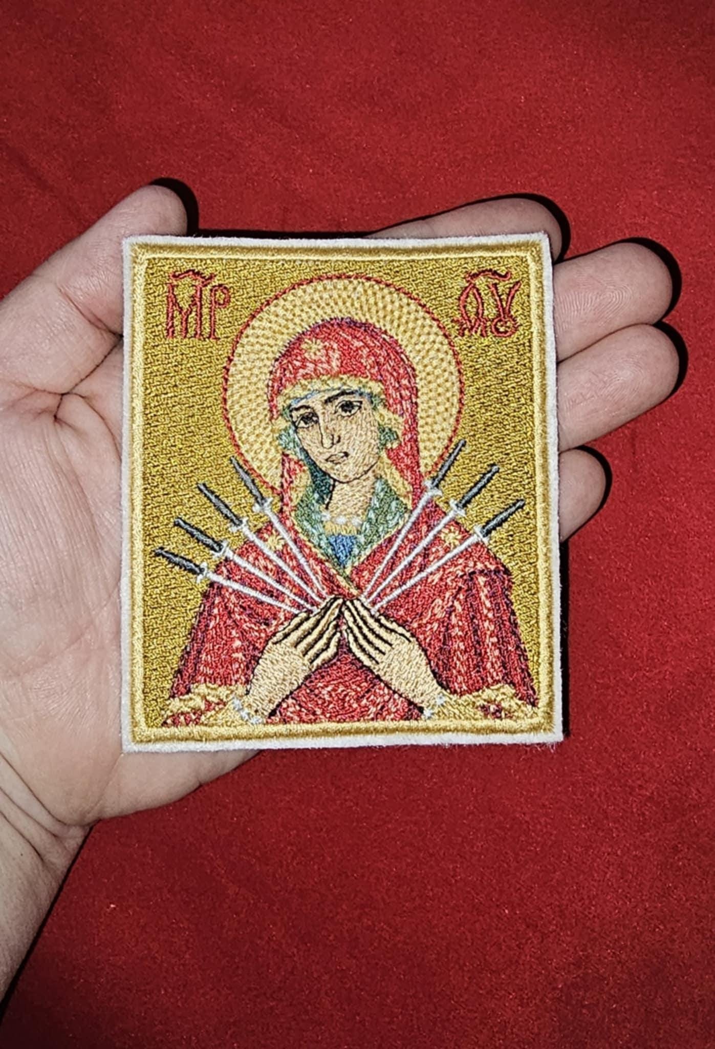 **3.5x4" Seven Arrows Icon of the Virgin Mary Orthodox Embroidered Pocket Icon or Patch**