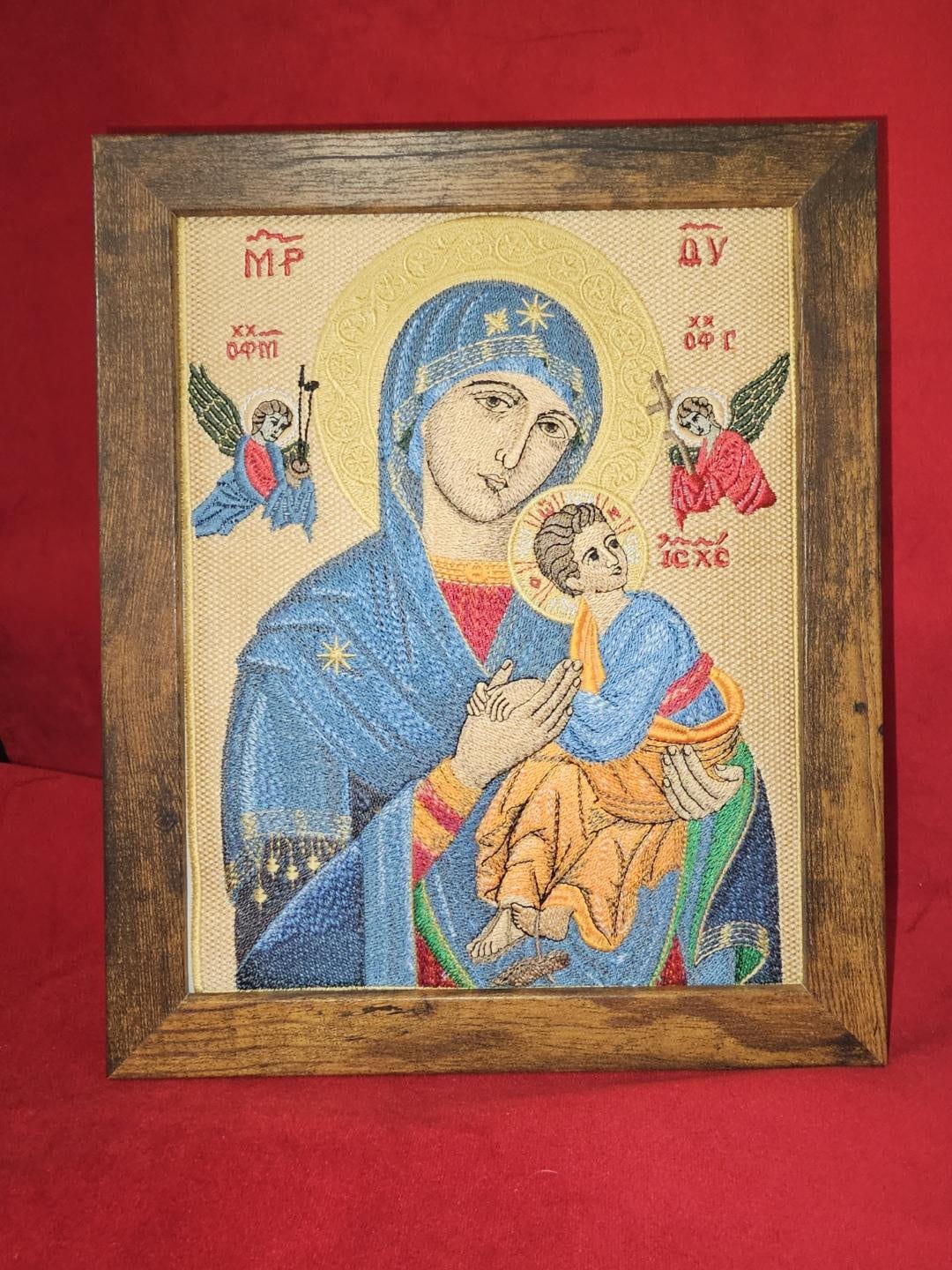 Elevate your surroundings with the timeless beauty and spiritual significance of Our Lady of Perpetual Help, captured in the artistry of Byzantine Orthodox Christian embroidery.