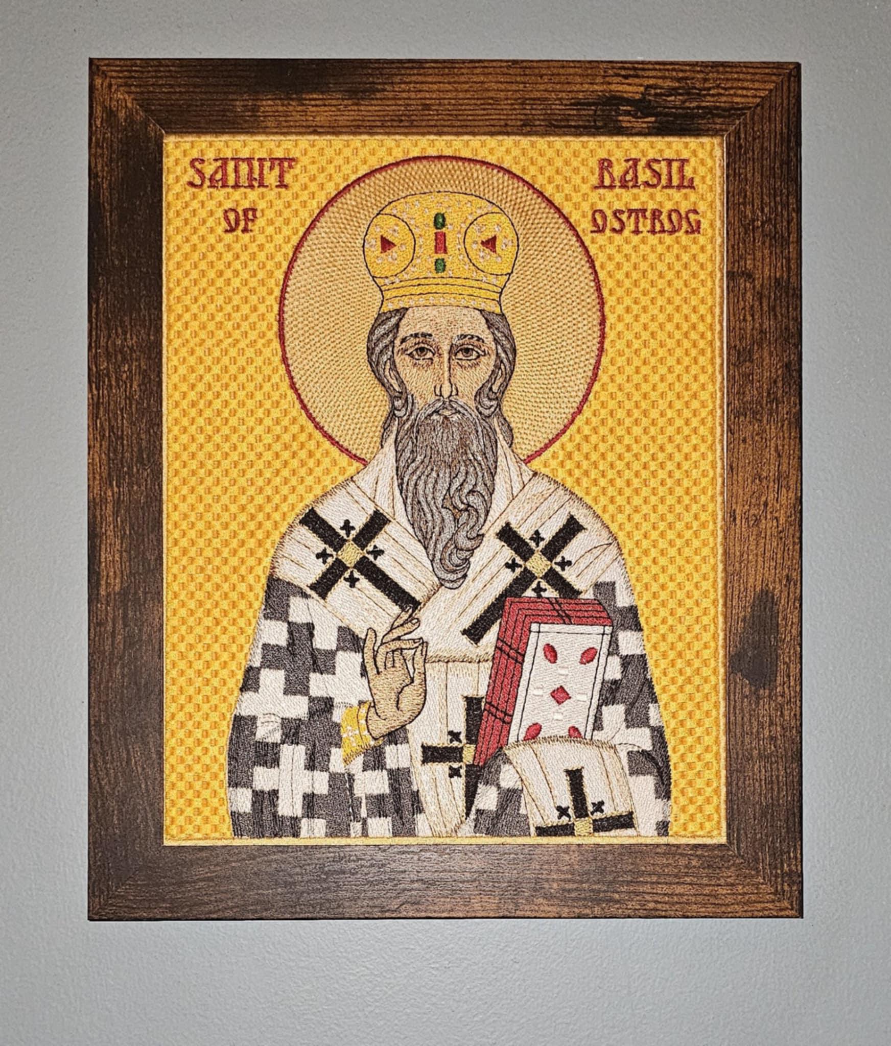 This 8x10" embroidered Orthodox icon honors St. Basil of Ostrog, one of the most revered saints in the Serbian Orthodox Church. Known for his deep humility, ascetic life, and miraculous intercessions, Saint Basil lived during the 17th century and served as the Metropolitan of Zahumlje and Herzegovina. He retreated to the Ostrog Monastery in Montenegro, where he lived in prayer and solitude until his repose in 1671.