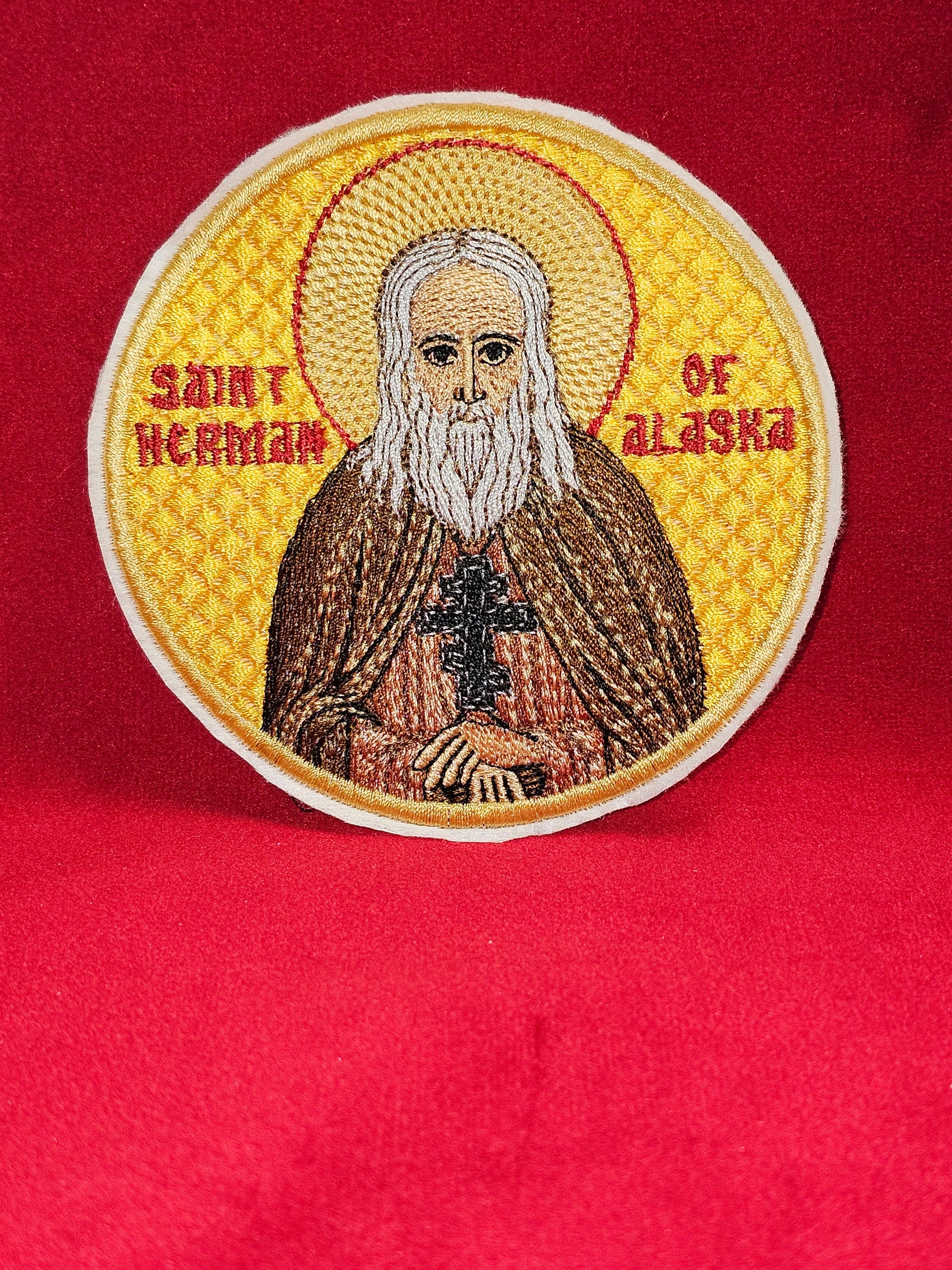 Carry the spiritual presence of St. Herman of Alaska with you wherever you go with this embroidered Orthodox pocket icon. Measuring 4 inches in size, this meticulously crafted piece is perfect for slipping into your pocket, purse, or travel bag, allowing you to bring a symbol of faith and inspiration with you on the journey of life.