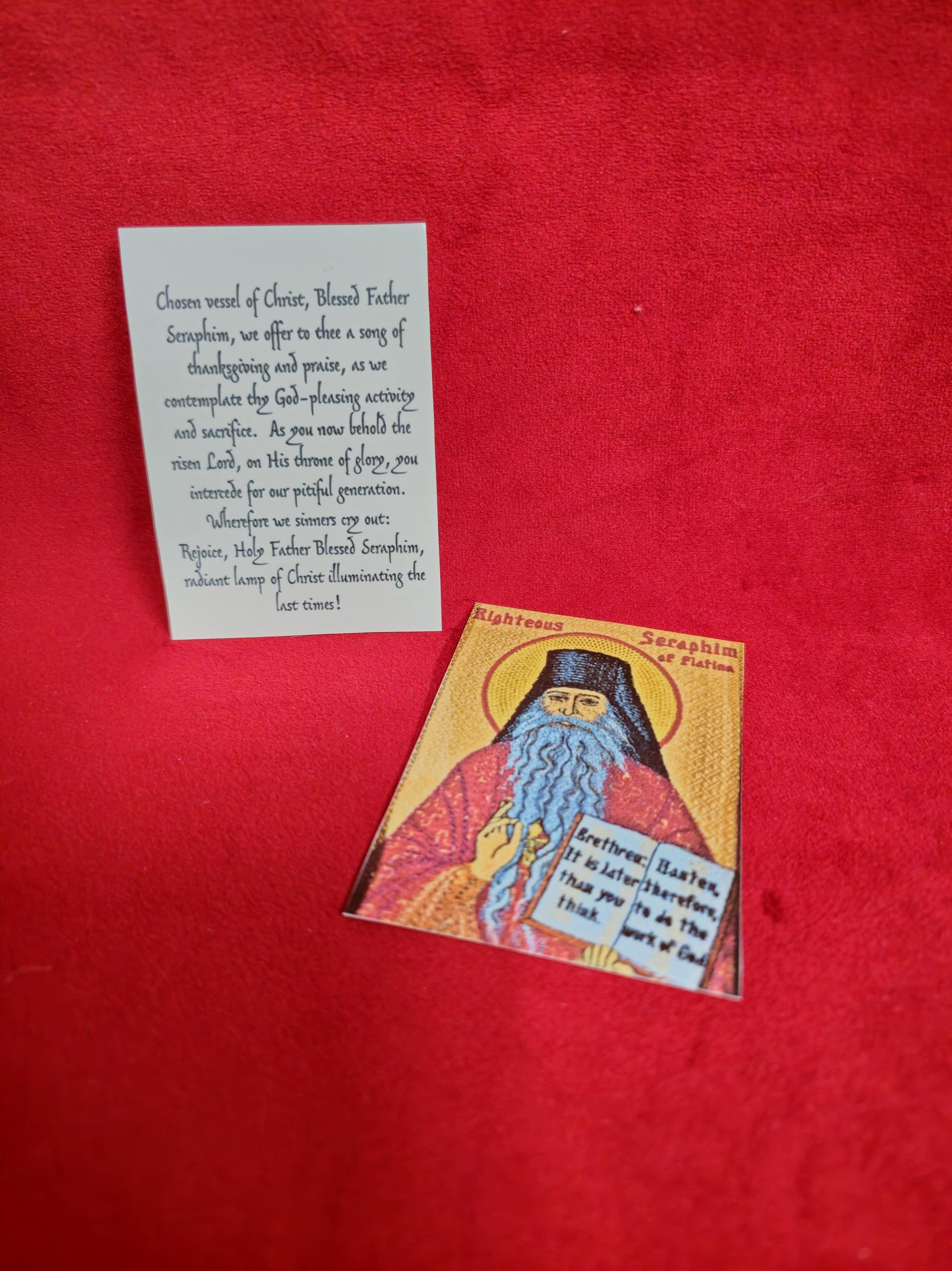 Made using a picture of Fr. Seraphim that we also make and sell in our shop, this item is printed and laminated completely in our own shop.
