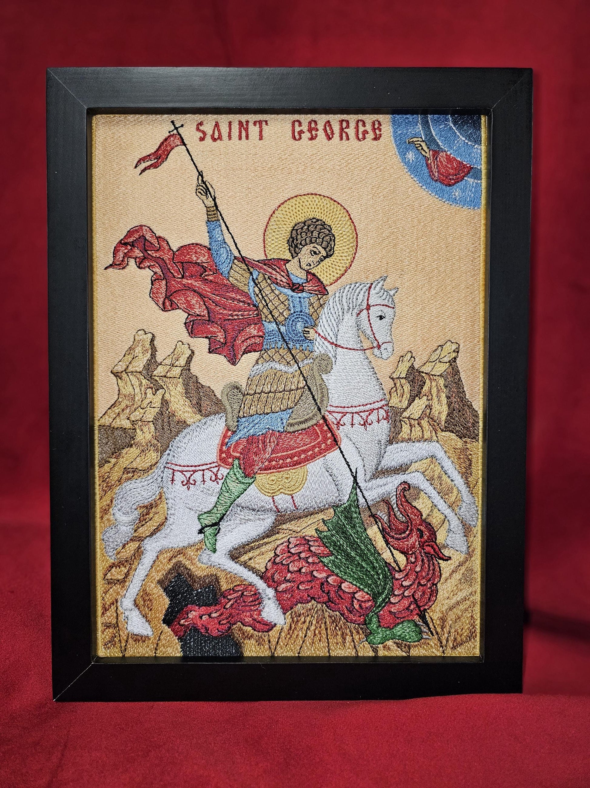 This embroidered icon of St. George and the Dragon is more than a decorative piece; it is a symbol of steadfast faith, bravery, and divine protection. Whether placed in your prayer corner, living room, or office, it serves as a daily reminder of the victory of good over evil and the power of divine intervention.