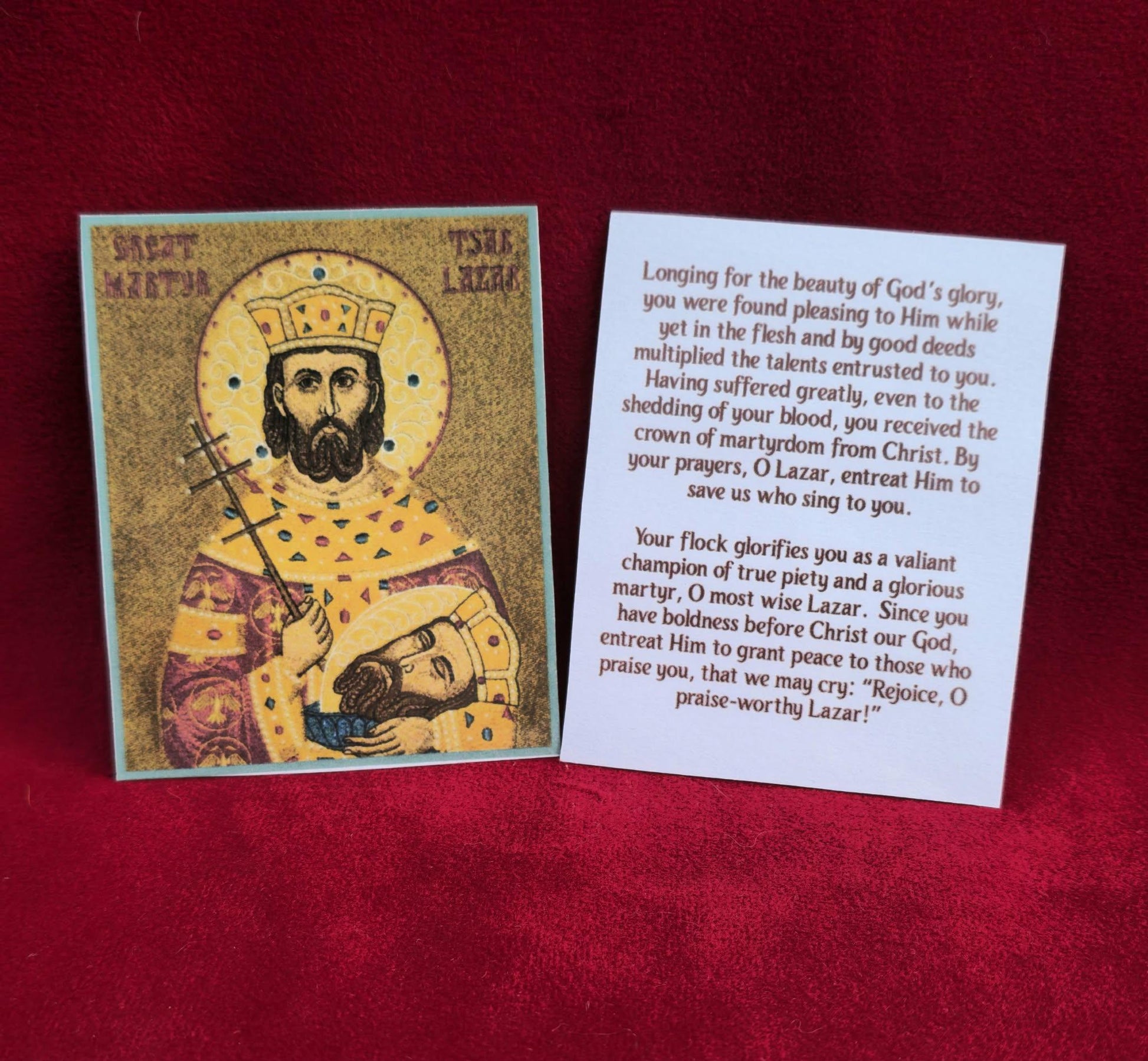 This laminated Orthodox prayer card features the traditional icon of Tsar Lazar, rendered with clear detail on a gold ground. The card is printed in miniature format and sealed for daily handling, travel, and placement in prayer books or wallets.