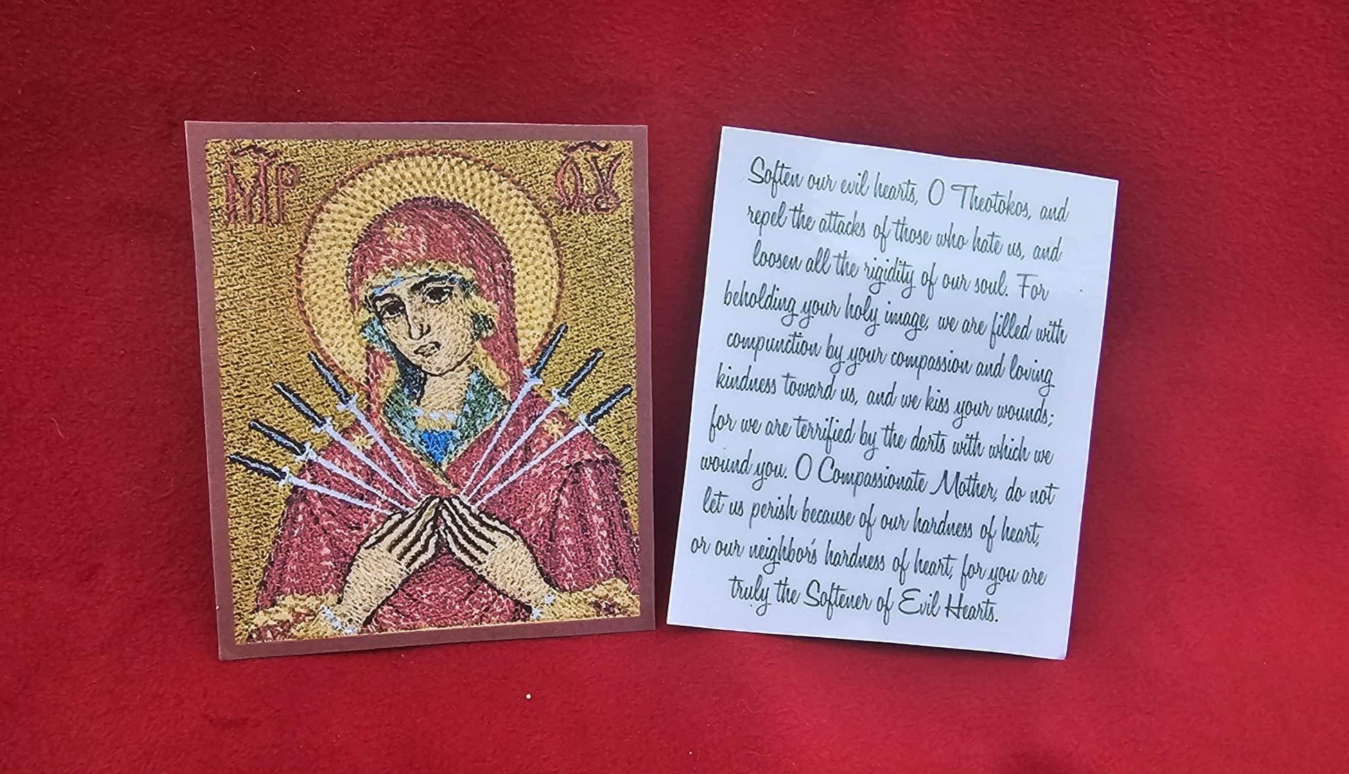 Honor the Mother of God with this “Softener of Evil Hearts” (Seven Arrows) laminated Orthodox prayer card — a powerful and beloved icon used for healing, reconciliation, and protection.