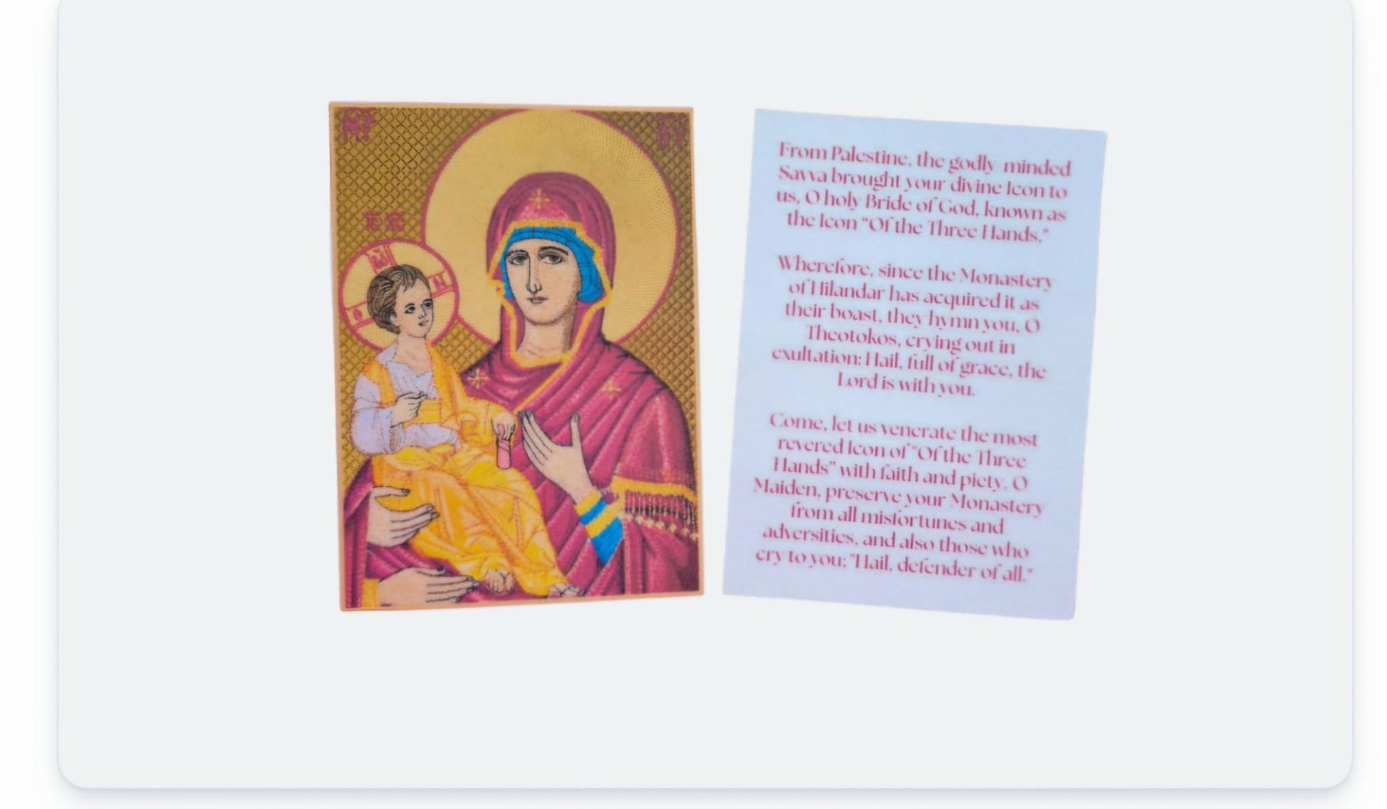 The icon of the Three Hands commemorates the miraculous healing of St. John of Damascus, who, in thanksgiving, offered a silver hand before the icon. The third hand remains a lasting symbol of faith, healing, and gratitude to the Mother of God.