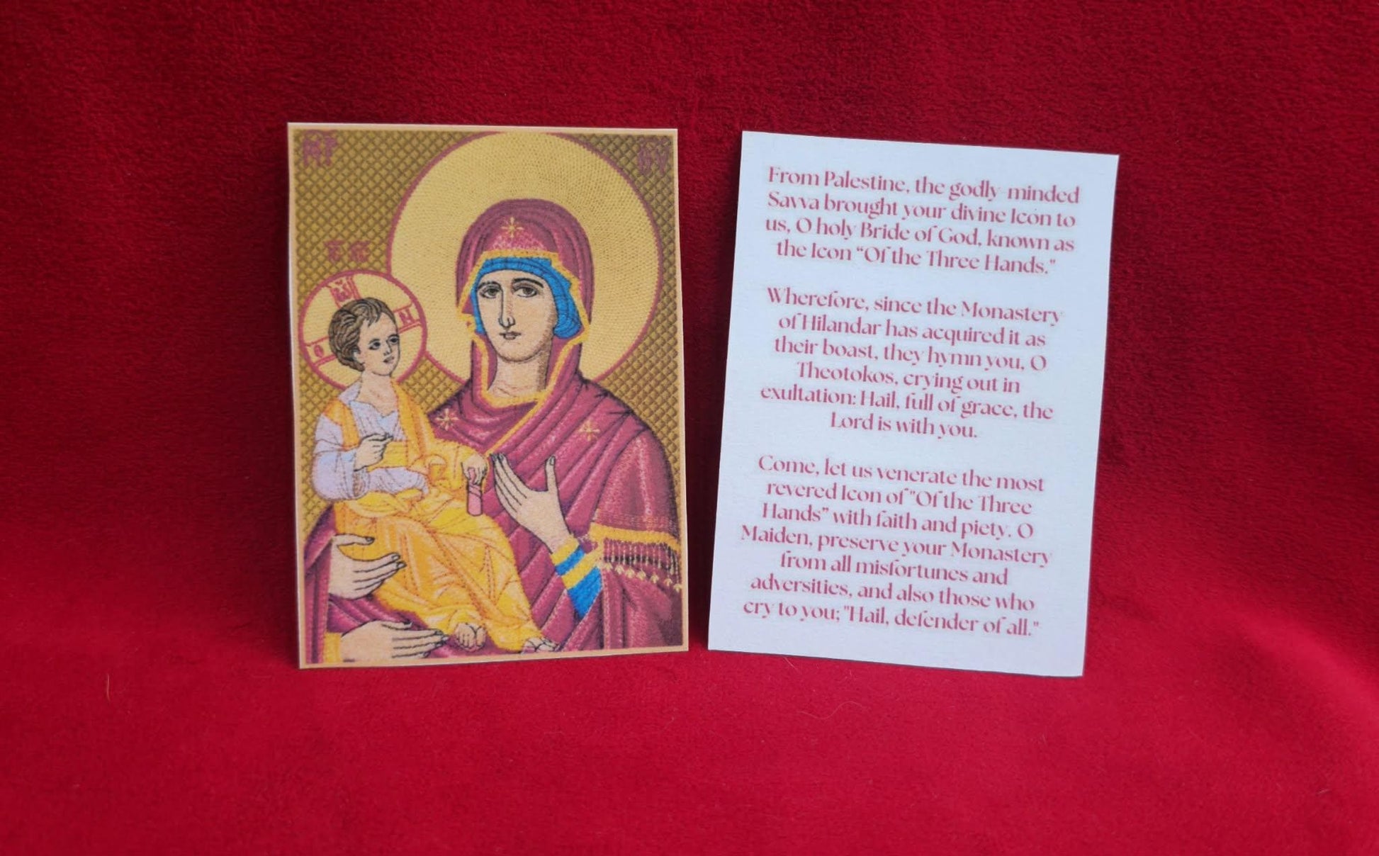 This Orthodox Christian prayer card features the revered icon of Theotokos of the Three Hands (Panagia Tricherousa), an icon deeply associated with healing, gratitude, and the intercession of the Mother of God.