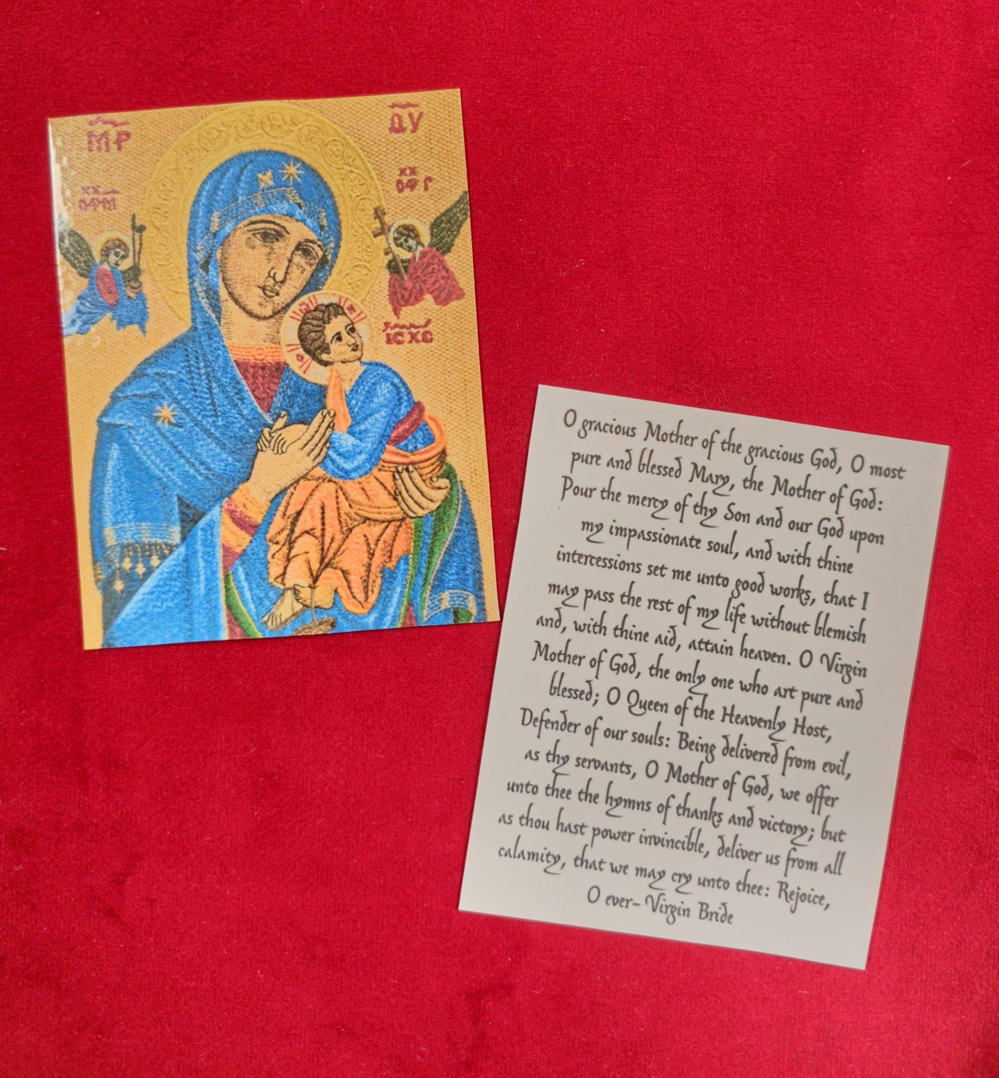 Celebrate and honor the divine protection of Our Lady of Perpetual Help with our elegant Laminated Orthodox Prayer Card. Featuring the revered Hodegetria icon, known for its depiction of the Theotokos holding the Christ Child and offering perpetual aid, these prayer cards are perfect for personal devotion, daily reflection, or thoughtful gifts.