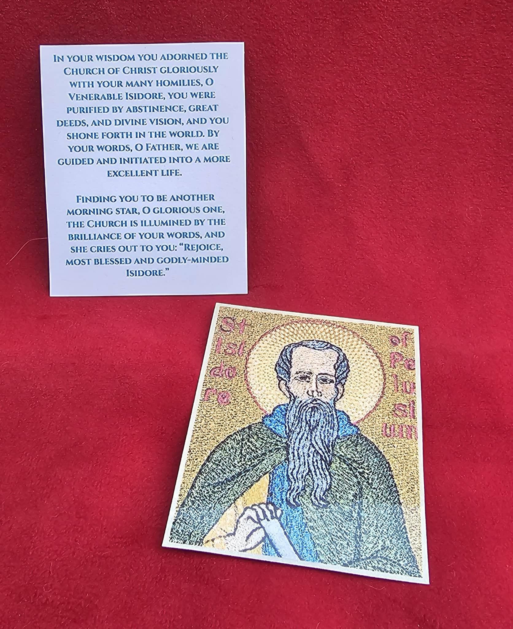This small laminated holy card features a printed version of our embroidered icon of Saint Isidore, the venerable hieromonk known for his purity, divine wisdom, and powerful homilies that illuminated the Church.