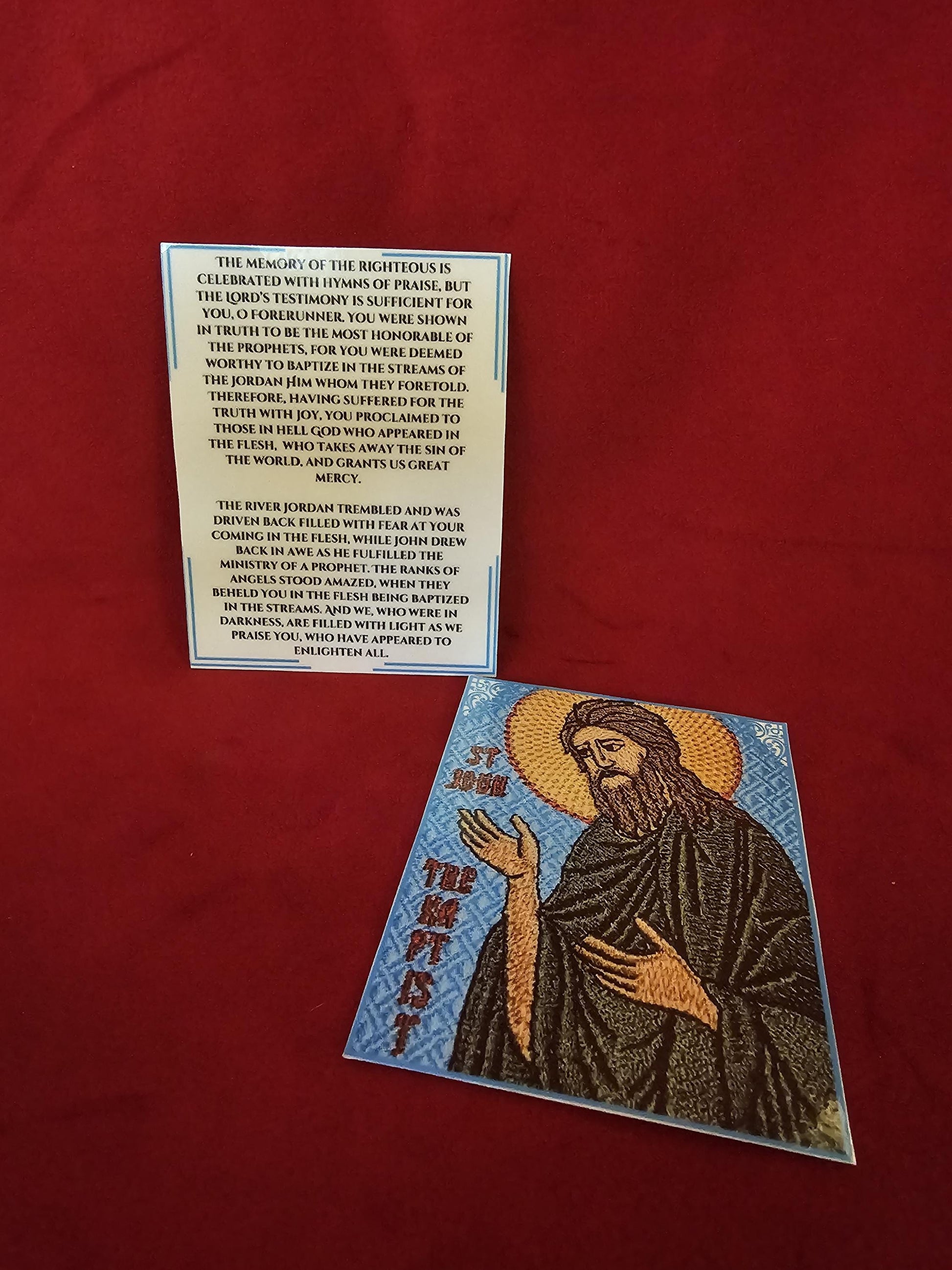 Honor the revered Saint John the Baptist, the forerunner of Christ, with this beautifully designed Orthodox prayer card. Featuring a striking image of Saint John made from an embroidered icon we offer here for sale, this laminated card is crafted for durability, making it an ideal companion for daily prayer or a cherished keepsake.