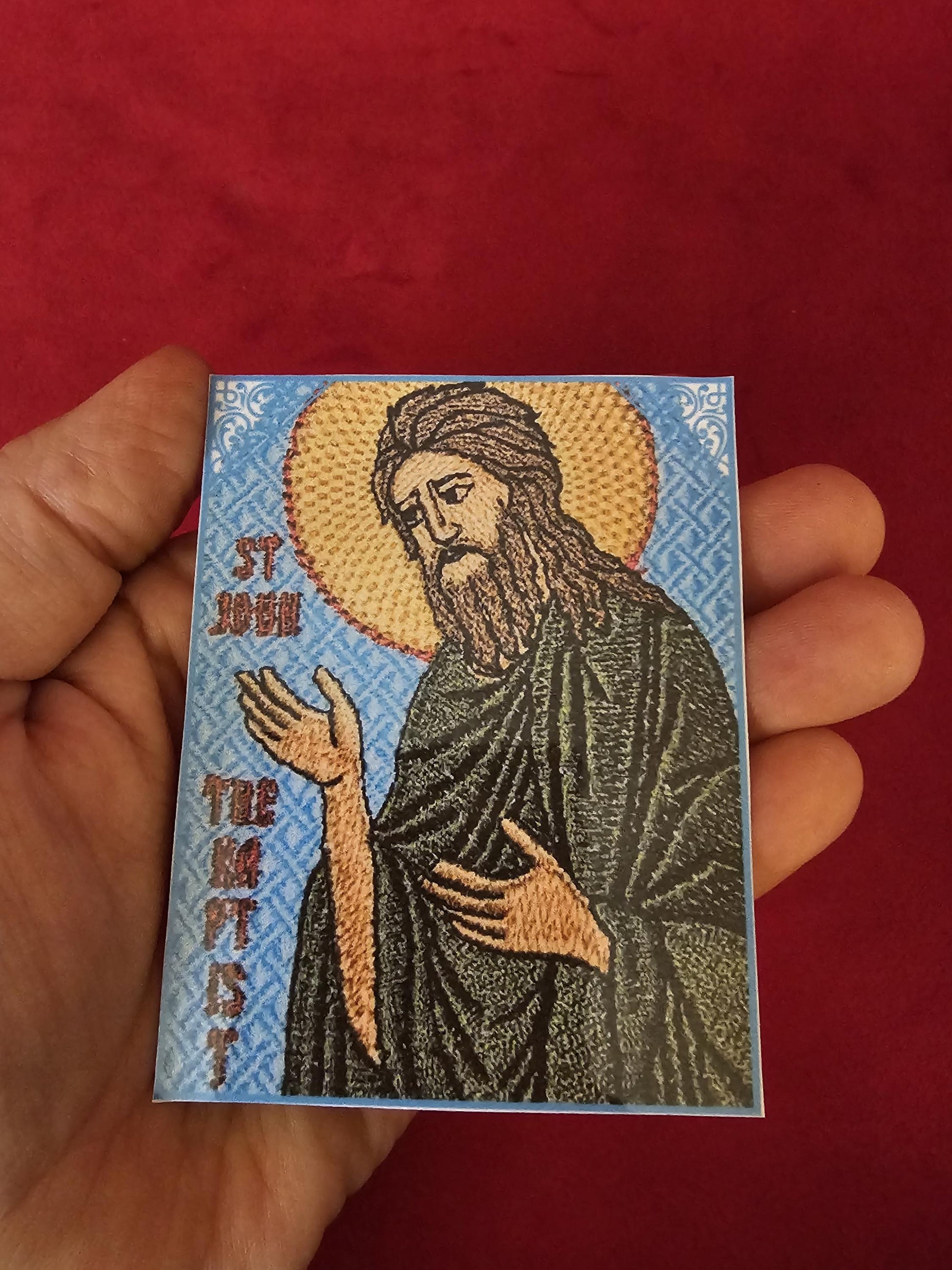 - **Design:** Features a vibrant depiction of Saint John the Baptist, with a prayer or inspirational message on the reverse side