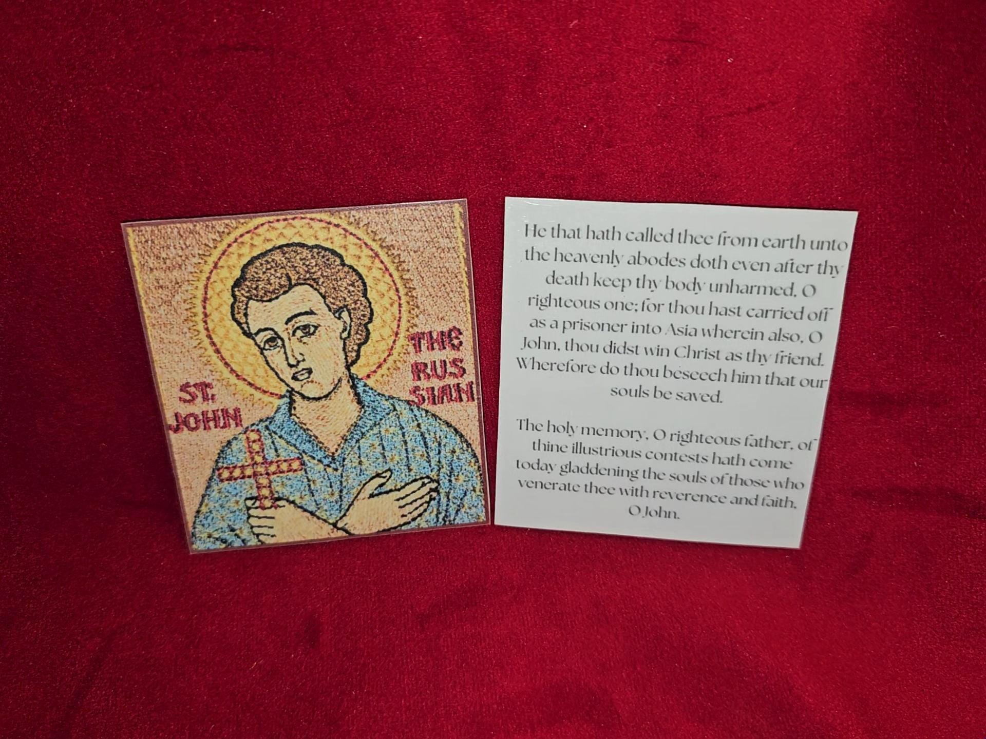 - **Design**: Features a detailed and inspiring icon of Saint John the Russian, known for his humility, faith, and miraculous intercessions.