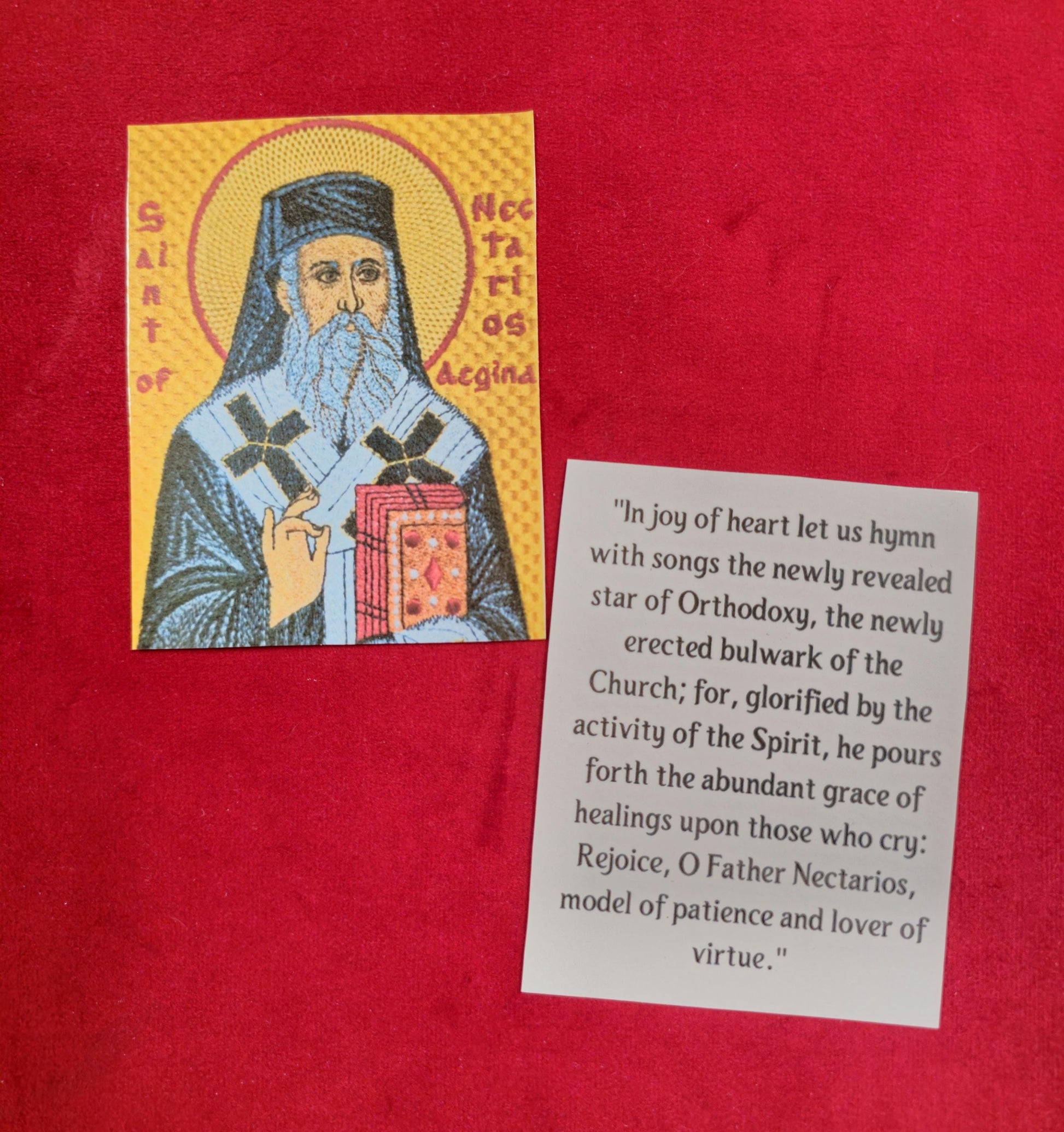 Enhance your spiritual journey with this beautifully crafted set of Saint Nectarios Orthodox prayer cards. Each card features a high-quality image of Saint Nectarios-featuring our own embroidered design (also available for sale here on Etsy), renowned for his miracles and spiritual guidance, and is laminated for durability and protection. Perfect for daily devotion, personal reflection, or as a thoughtful gift for loved ones, these prayer cards are designed to withstand regular use while maintaining their vibrant appearance. These are completely made in our shop, from the print out to the lamination.