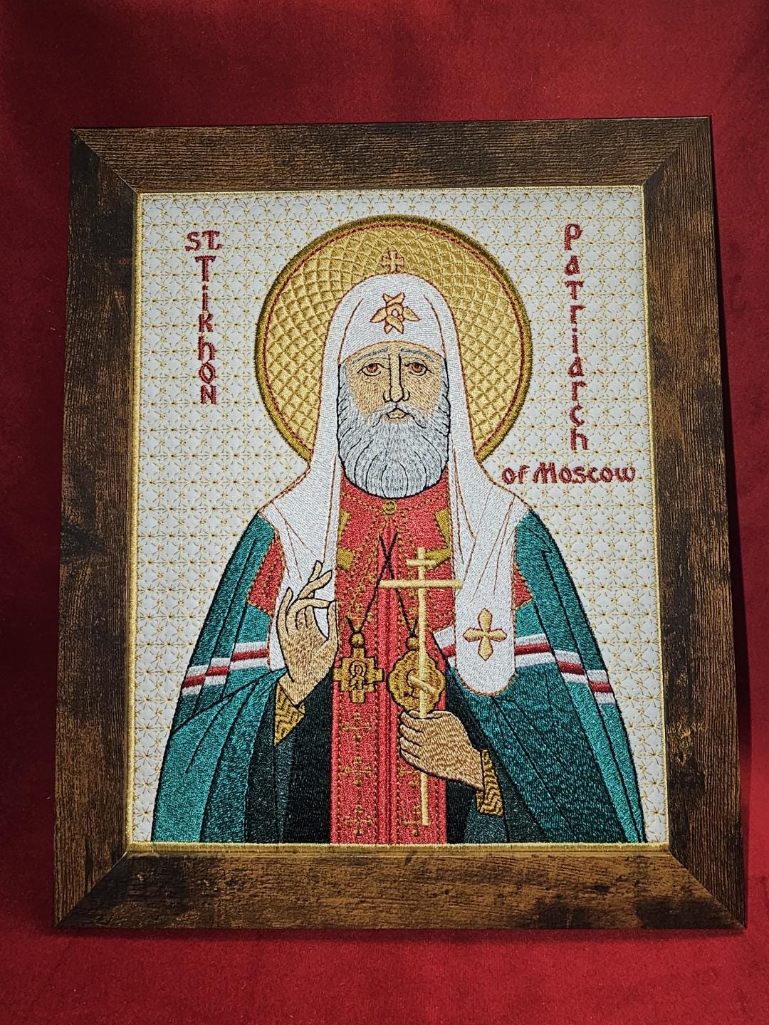 Bring the inspiring legacy of Saint Tikhon into your home with this exquisite embroidered icon. Order now and honor his memory with this timeless piece of art