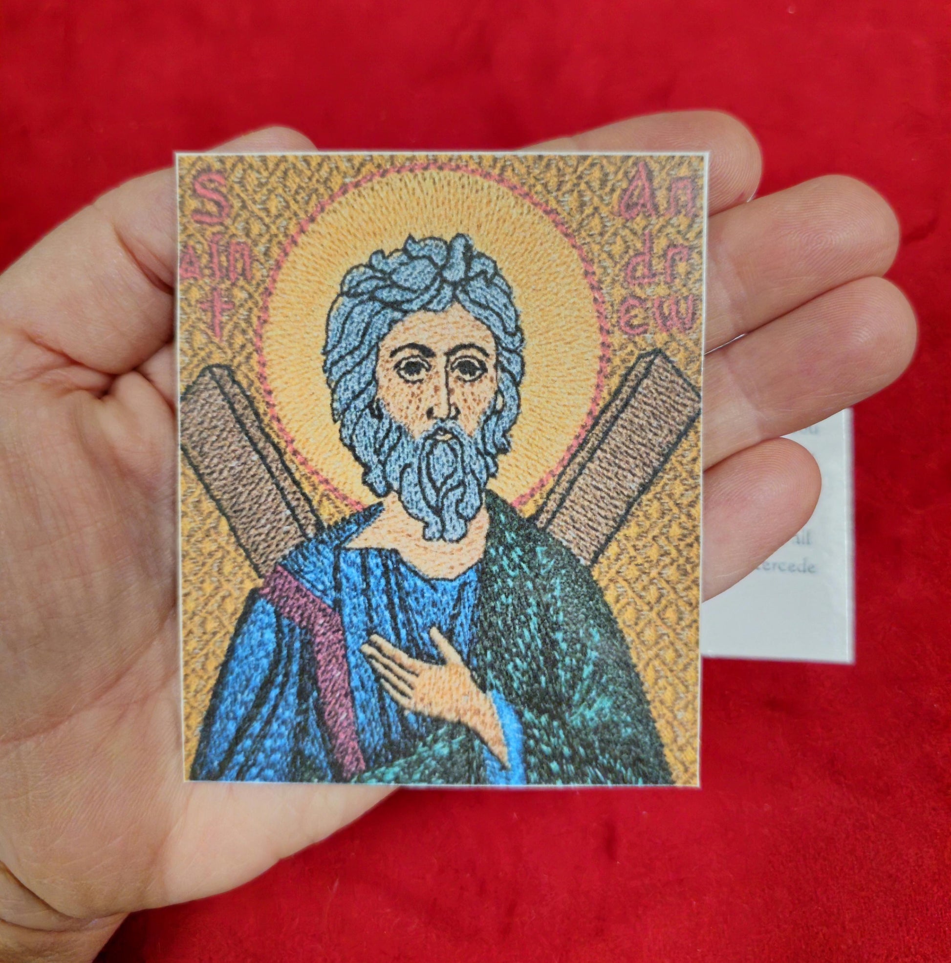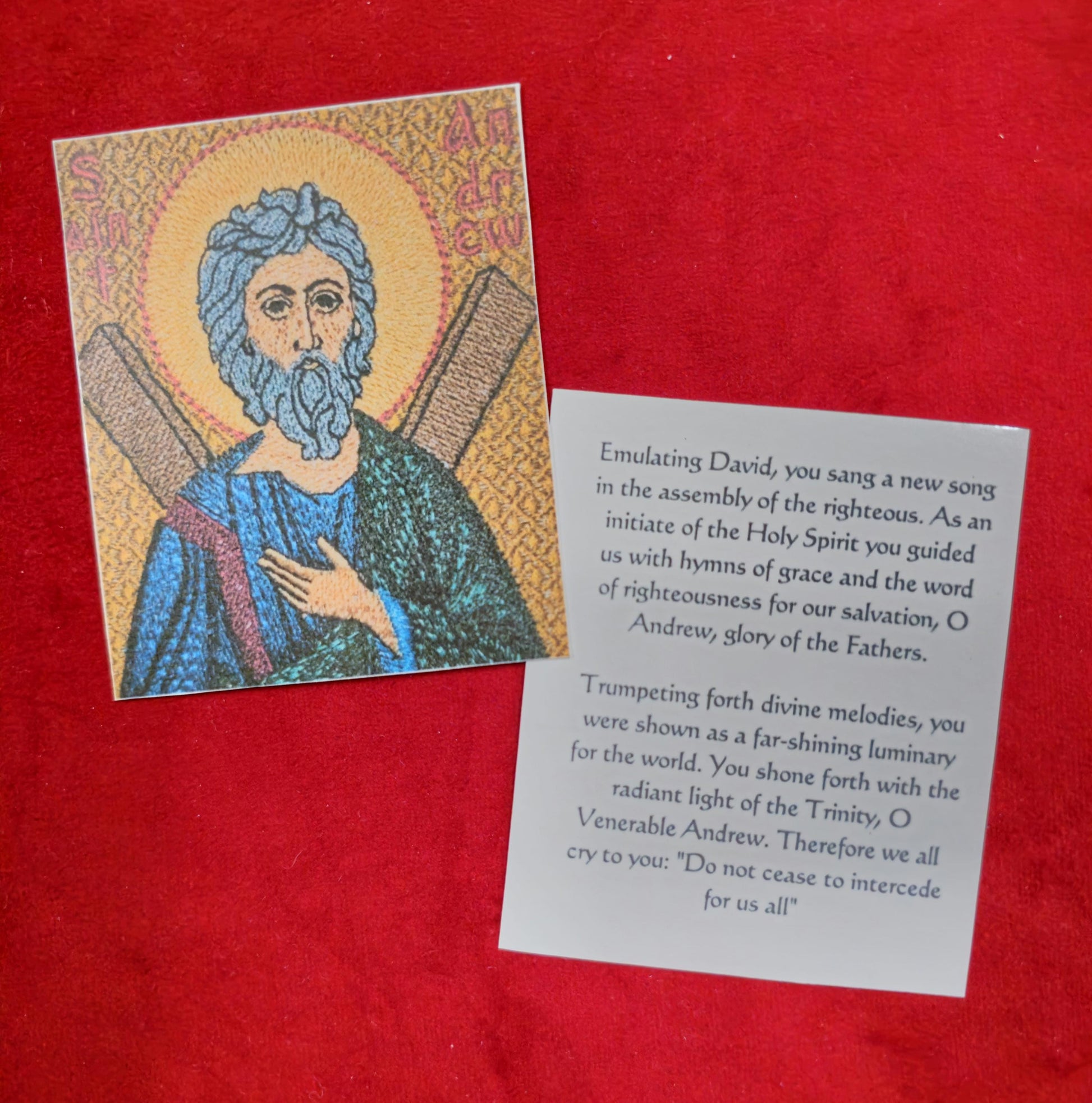 Prominently features one of our embroidered icons of St. Andrew, which we make and sell here on our shop. Item is made and laminated in our shop.