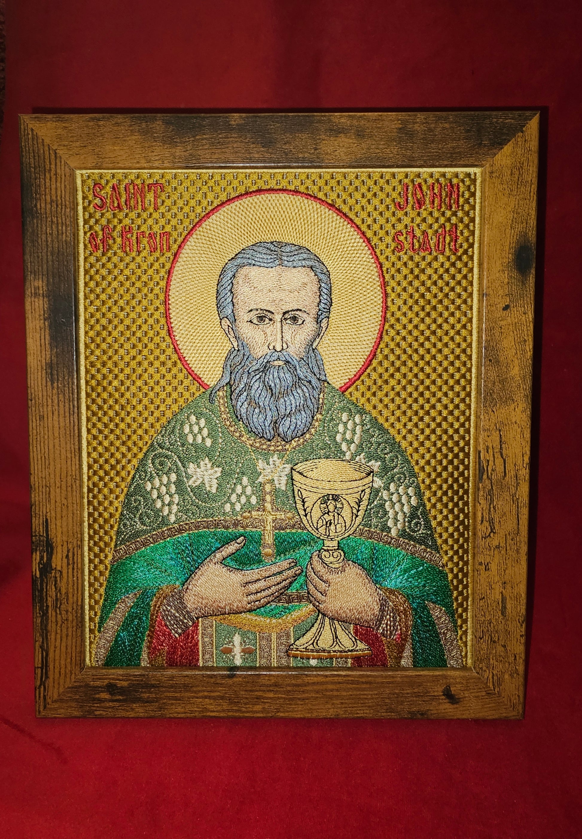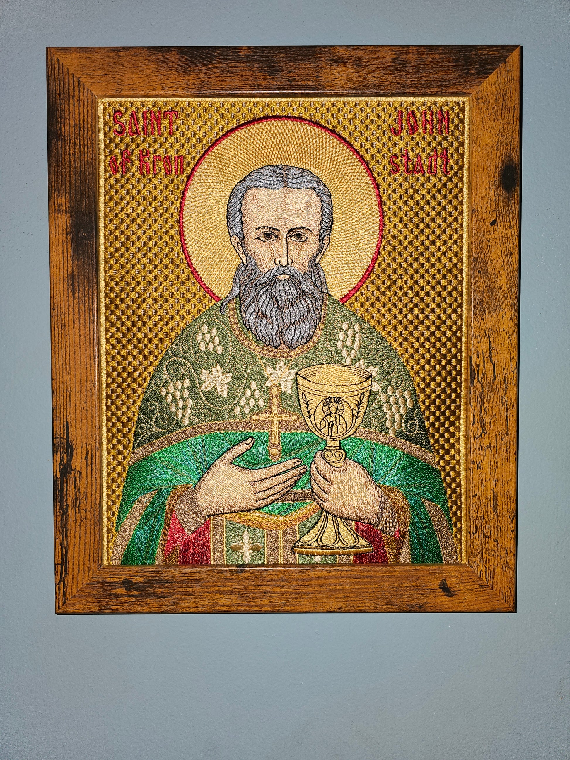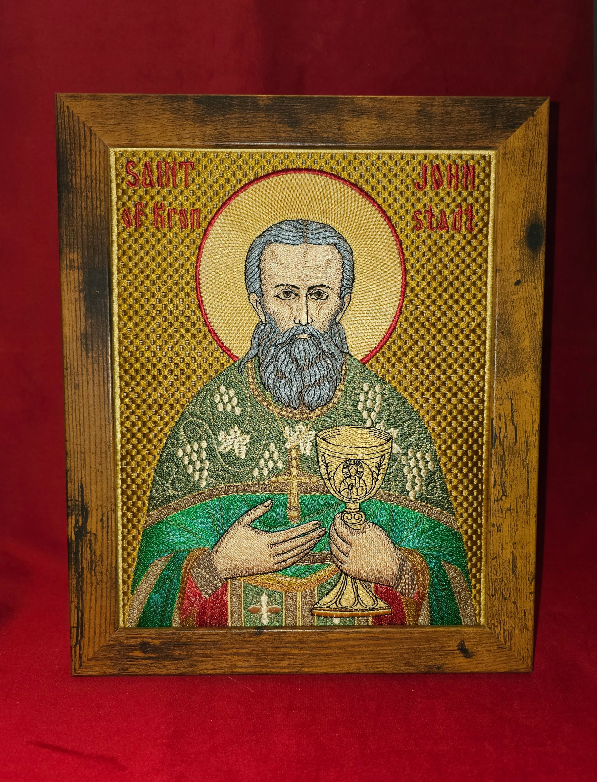 Elevate your spiritual ambiance with the timeless beauty of St. John of Kronstadt, captured in the intricate artistry of Byzantine Orthodox Christian embroidery.