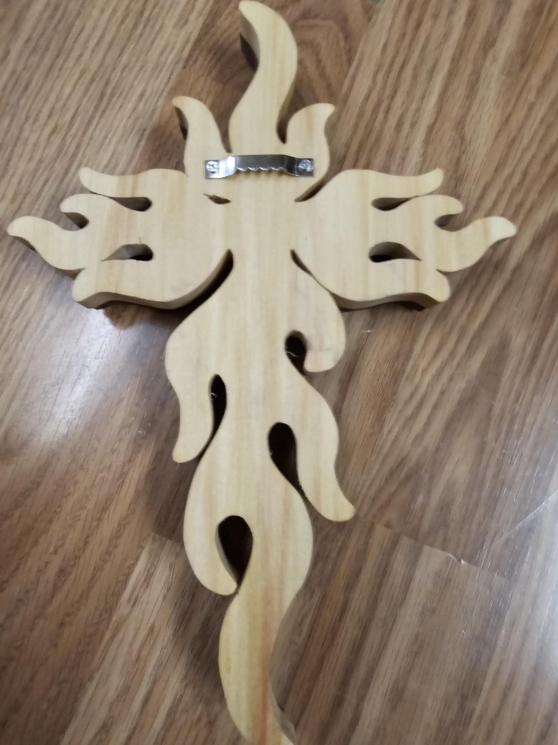 This beautiful wooden Flaming Cross was scroll sawn by hand- NO lasers or CNC machines were used whatsoever. Each cross measures roughly 11x7.5 inches and are roughly .75 inches thick. Since the grain is unique, we are offering pictures only of the actual cross for sale so inventory is extremely low as what you see pictured is exactly the Cross you will get. Multiple choices for this unique cross!